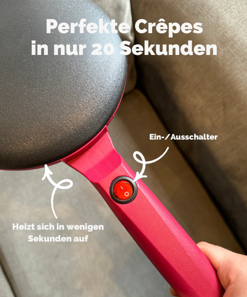 Der Crêpe Meister Set ist sehr einfach zu bedienen. Heize das Gerät vor, tauche die Antihaft-Oberfläche in den Teig – und nach nur 20 Sekunden hast du einen perfekt gebackenen Crêpe. Der ergonomische Griff und die automatische Temperaturregelung machen die Zubereitung besonders leicht und angenehm.